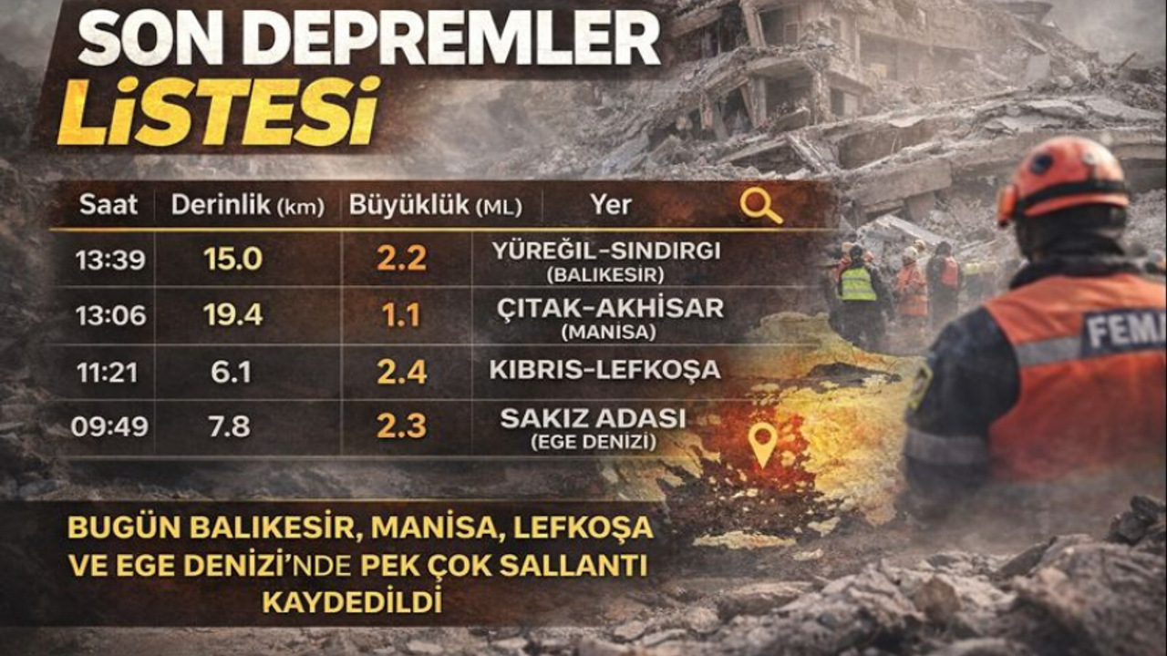 Tarih Saat Enlem(N) Boylam(E) Derinlik(km) MD ML Mw Yer Çözüm Niteliği ---------- -------- -------- ------- ---------- ------------ -------------- -------------- 2026.01.22 13:39:40 39.1327 28.2793 15.0 -.- 2.2 -.- YUREGIL-SINDIRGI (BALIKESIR) İlksel 2026.01.22 13:34:14 39.1143 28.3348 9.2 -.- 1.4 -.- YUREGIL-SINDIRGI (BALIKESIR) İlksel 2026.01.22 13:06:16 38.9555 28.1390 19.4 -.- 1.1 -.- CITAK-AKHISAR (MANISA) İlksel 2026.01.22 12:54:03 39.4188 28.0983 13.9 -.- 1.7 -.- BADEMLI-BIGADIC (BALIKESIR) İlksel 2026.01.22 12:47:14 39.0153 38.0913 2.5 -.- 1.9 -.- YUKARISAZ-HEKIMHAN (MALATYA) İlksel 2026.01.22 12:39:53 39.0338 28.2543 5.4 -.- 1.1 -.- BEGEL-GORDES (MANISA) İlksel 2026.01.22 12:37:09 38.8087 37.5015 5.0 -.- 2.0 -.- BAGLICAY-GURUN (SIVAS) İlksel 2026.01.22 12:31:11 37.7518 27.6933 20.5 -.- 1.2 -.- BUYUKDERE-KOCARLI (AYDIN) İlksel 2026.01.22 12:27:14 38.9290 28.4392 3.0 -.- 1.3 -.- BAYRAMSAH-DEMIRCI (MANISA) İlksel 2026.01.22 12:06:22 39.2613 29.0010 2.8 -.- 1.8 -.- YESILDERE-SIMAV (KUTAHYA) İlksel 2026.01.22 11:21:57 34.9615 33.4283 6.1 -.- 2.4 -.- KIBRIS-LEFKOSA İlksel 2026.01.22 11:20:34 39.1367 28.2788 16.8 -.- 1.4 -.- YUREGIL-SINDIRGI (BALIKESIR) İlksel 2026.01.22 11:17:46 39.1412 28.3175 8.7 -.- 1.5 -.- YUREGIL-SINDIRGI (BALIKESIR) İlksel 2026.01.22 10:58:20 39.1318 28.2322 10.5 -.- 1.0 -.- BAYRAKLI-SINDIRGI (BALIKESIR) İlksel 2026.01.22 10:57:03 38.8305 37.4162 5.0 -.- 2.0 -.- KULAHLI-GURUN (SIVAS) İlksel 2026.01.22 10:53:40 39.1652 28.2938 12.8 -.- 1.6 -.- ISIKLAR-SINDIRGI (BALIKESIR) İlksel 2026.01.22 10:41:27 39.2473 28.9995 8.7 -.- 2.4 -.- YEMISLI-SIMAV (KUTAHYA) İlksel 2026.01.22 10:38:21 39.0583 28.3630 3.1 -.- 1.5 -.- DARGIL-GORDES (MANISA) İlksel 2026.01.22 10:37:12 38.8248 37.4435 5.3 -.- 1.8 -.- KULAHLI-GURUN (SIVAS) İlksel 2026.01.22 10:33:23 39.1475 28.4512 11.6 -.- 2.5 -.- DEVLETLIBABA-SINDIRGI (BALIKESIR) İlksel 2026.01.22 10:32:48 38.9913 40.5168 3.4 -.- 2.1 -.- AGACYOLU-(BINGOL) İlksel 2026.01.22 10:04:53 39.0197 28.3060 17.8 -.- 1.3 -.- MALAZ-GORDES (MANISA) İlksel 2026.01.22 09:49:19 38.2510 25.8693 7.8 -.- 2.3 -.- SAKIZ ADASI (EGE DENIZI) İlksel 2026.01.22 09:46:31 39.1182 28.3353 9.2 -.- 1.7 -.- YUREGIL-SINDIRGI (BALIKESIR) İlksel 2026.01.22 09:42:34 39.1700 28.1505 14.5 -.- 1.5 -.- SINANDEDE-SINDIRGI (BALIKESIR) İlksel 2026.01.22 09:39:22 39.1623 28.2405 12.7 -.- 1.8 -.- BAYRAKLI-SINDIRGI (BALIKESIR) İlksel 2026.01.22 09:32:42 38.9803 40.4822 1.0 -.- 2.7 -.- CICEKDERE-(BINGOL) İlksel 2026.01.22 09:12:28 39.1387 28.3030 13.8 -.- 1.7 -.- YUREGIL-SINDIRGI (BALIKESIR) İlksel 2026.01.22 08:34:31 39.1652 28.2477 11.7 -.- 2.3 -.- BAYRAKLI-SINDIRGI (BALIKESIR) İlksel 2026.01.22 08:19:13 38.8457 28.1535 25.6 -.- 0.9 -.- YAKAKOY-GORDES (MANISA) İlksel 2026.01.22 08:11:00 38.8697 28.0643 26.9 -.- 1.0 -.- YAYAKIRILDIK-AKHISAR (MANISA) İlksel 2026.01.22 08:09:58 38.7647 27.8338 8.6 -.- 1.4 -.- KUMKUYUCAK-SARUHANLI (MANISA) İlksel 2026.01.22 08:02:58 39.1445 28.2980 10.9 -.- 1.6 -.- YUREGIL-SINDIRGI (BALIKESIR) İlksel 2026.01.22 07:53:54 39.1242 28.3185 12.0 -.- 2.8 -.- YUREGIL-SINDIRGI (BALIKESIR) İlksel 2026.01.22 07:51:26 39.1015 28.2928 13.1 -.- 1.5 -.- YUREGIL-SINDIRGI (BALIKESIR) İlksel 2026.01.22 07:32:26 39.1358 28.3330 9.6 -.- 1.8 -.- YUREGIL-SINDIRGI (BALIKESIR) İlksel 2026.01.22 07:19:04 39.0908 28.2962 18.9 -.- 1.2 -.- YUREGIL-SINDIRGI (BALIKESIR) İlksel 2026.01.22 07:00:28 36.9417 27.7048 13.9 -.- 1.5 -.- GOKOVA KORFEZI (EGE DENIZI) İlksel 2026.01.22 06:44:42 38.2372 37.8117 7.8 -.- 1.7 -.- DEDEYAZI-DOGANSEHIR (MALATYA) İlksel 2026.01.22 06:41:08 39.1503 28.3235 10.5 -.- 1.6 -.- KUCUKDAGDERE-SINDIRGI (BALIKESIR) İlksel 2026.01.22 06:21:37 38.5632 31.8588 7.4 -.- 1.4 -.- YESILOBA-YUNAK (KONYA) İlksel 2026.01.22 06:14:14 39.1005 28.3163 10.0 -.- 1.5 -.- YUREGIL-SINDIRGI (BALIKESIR) İlksel 2026.01.22 06:08:33 39.1397 28.3257 8.6 -.- 1.5 -.- YUREGIL-SINDIRGI (BALIKESIR) İlksel 2026.01.22 05:59:32 39.1152 28.3335 11.7 -.- 1.2 -.- YUREGIL-SINDIRGI (BALIKESIR) İlksel 2026.01.22 05:50:10 38.7783 37.4703 15.7 -.- 1.4 -.- BAGLICAY-GURUN (SIVAS) İlksel 2026.01.22 05:47:03 38.1288 36.9077 6.0 -.- 1.5 -.- KEMALPASA-GOKSUN (KAHRAMANMARAS) İlksel 2026.01.22 05:44:10 38.8110 37.4720 5.0 -.- 2.9 -.- BAGLICAY-GURUN (SIVAS) İlksel 2026.01.22 05:43:13 39.2402 28.1117 14.6 -.- 2.1 -.- BAYIRLI-SINDIRGI (BALIKESIR) İlksel 2026.01.22 05:39:14 39.1088 28.3170 12.4 -.- 1.4 -.- YUREGIL-SINDIRGI (BALIKESIR) İlksel 2026.01.22 05:32:50 39.1257 28.3318 13.5 -.- 1.6 -.- YUREGIL-SINDIRGI (BALIKESIR) İlksel 2026.01.22 04:55:40 39.2510 28.1017 14.5 -.- 3.4 -.- KARAGUR-SINDIRGI (BALIKESIR) İlksel 2026.01.22 04:53:01 39.2255 28.0855 13.6 -.- 1.6 -.- KOZLU-SINDIRGI (BALIKESIR) İlksel 2026.01.22 04:46:03 39.1672 28.2712 15.4 -.- 1.7 -.- ISIKLAR-SINDIRGI (BALIKESIR) İlksel 2026.01.22 04:42:31 35.8085 27.4875 5.0 -.- 2.8 -.- EGE DENIZI İlksel 2026.01.22 03:45:40 39.1462 28.3027 10.6 -.- 1.4 -.- YUREGIL-SINDIRGI (BALIKESIR) İlksel 2026.01.22 03:40:54 39.1693 28.3250 9.5 -.- 1.4 -.- KUCUKDAGDERE-SINDIRGI (BALIKESIR) İlksel 2026.01.22 03:40:28 39.2138 28.1585 9.8 -.- 1.5 -.- YAYLACIK-SINDIRGI (BALIKESIR) İlksel 2026.01.22 03:28:35 39.0730 26.9055 8.2 -.- 1.4 -.- DIKILI (IZMIR) İlksel 2026.01.22 03:26:15 40.6902 29.2722 10.7 -.- 1.5 -.- YALOVA ACIKLARI (MARMARA DENIZI) İlksel 2026.01.22 03:03:27 39.1167 28.2638 15.0 -.- 2.1 -.- YUREGIL-SINDIRGI (BALIKESIR) İlksel 2026.01.22 02:56:51 39.1252 28.3083 13.4 -.- 1.7 -.- YUREGIL-SINDIRGI (BALIKESIR) İlksel 2026.01.22 02:54:46 39.2438 28.0197 8.7 -.- 1.6 -.- KIZILGUR-SINDIRGI (BALIKESIR) İlksel 2026.01.22 02:53:14 39.1065 28.3210 13.7 -.- 1.9 -.- YUREGIL-SINDIRGI (BALIKESIR) İlksel 2026.01.22 02:49:17 39.1130 28.2723 12.0 -.- 1.3 -.- YUREGIL-SINDIRGI (BALIKESIR) İlksel 2026.01.22 02:47:11 39.1512 28.2742 9.9 -.- 3.1 -.- YUREGIL-SINDIRGI (BALIKESIR) İlksel 2026.01.22 02:45:24 39.2488 28.0998 8.4 -.- 1.6 -.- KOZLU-SINDIRGI (BALIKESIR) İlksel 2026.01.22 02:44:14 39.1107 28.3382 11.7 -.- 2.2 -