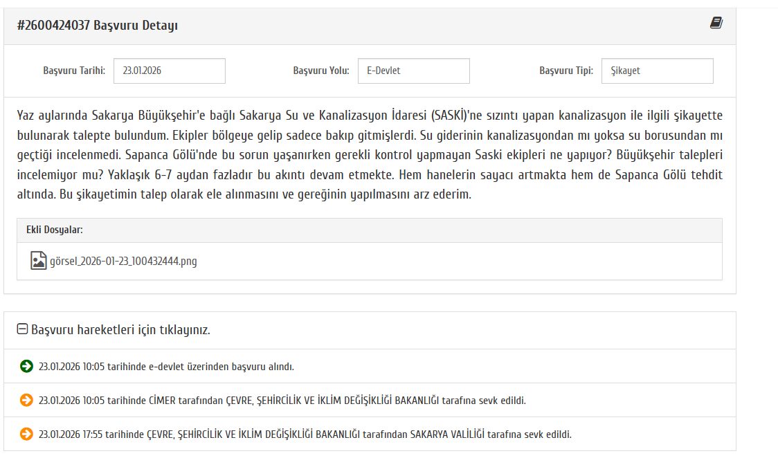 “Yaklaşık 6-7 aydan fazladır bu akıntı devam etmekte. Hem hanelerin su sayaçları artmakta hem de Sapanca Gölü tehdit altında. Bu şikayetimin talep olarak ele alınmasını ve gereğinin yapılmasını arz ederim.”