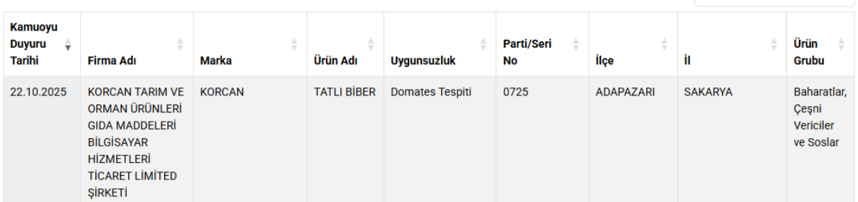 Bakanlık açıklamasına göre, Adapazarı ilçesinde faaliyet gösteren Korcan Tarım ve Orman Ürünleri şirketinin ürettiği Tatlı Biber baharatı, yapılan laboratuvar analizlerinde domates tespit edilmesi nedeniyle taklit ve tağşişli ürün olarak kayıtlara geçti.