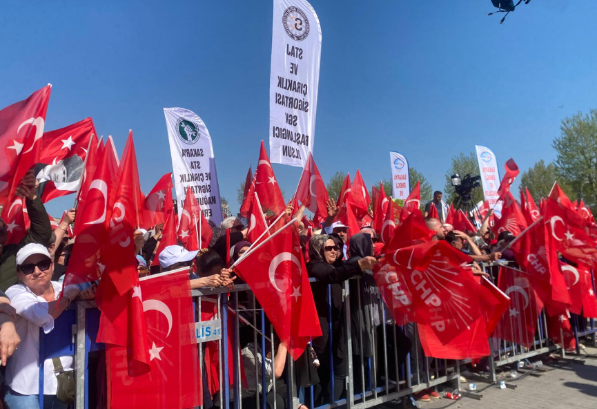 Miting öncesi meydan çevresinde yoğun güvenlik önlemleri alınırken, vatandaşların alana girişleri kontrollü şekilde sağlandı.