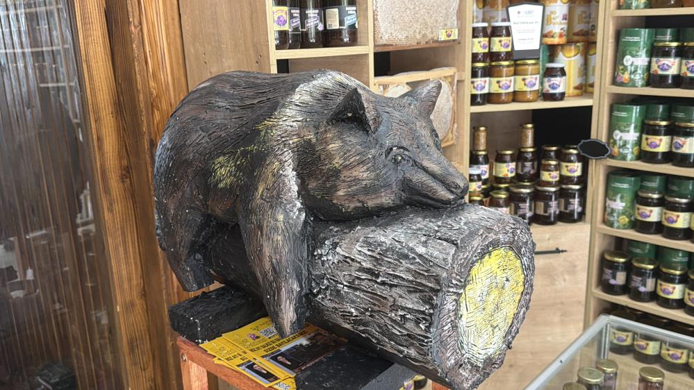 Dükkândaki ahşap dekorun da müşterilerin dikkatini çektiğini ifade eden Söğüt, “Ayının köylüler tarafından baygın hâlde bulunup pikap arkasına konulduğu görüntüler çok konuşulmuştu. Biz de hatıra olması için kütükten bir çalışma yaptık. Üzerine arı kovanı ve ayı figürü ekledik. Fuar alanlarında sergilediğimizde büyük ilgi görüyor” diye konuştu.
