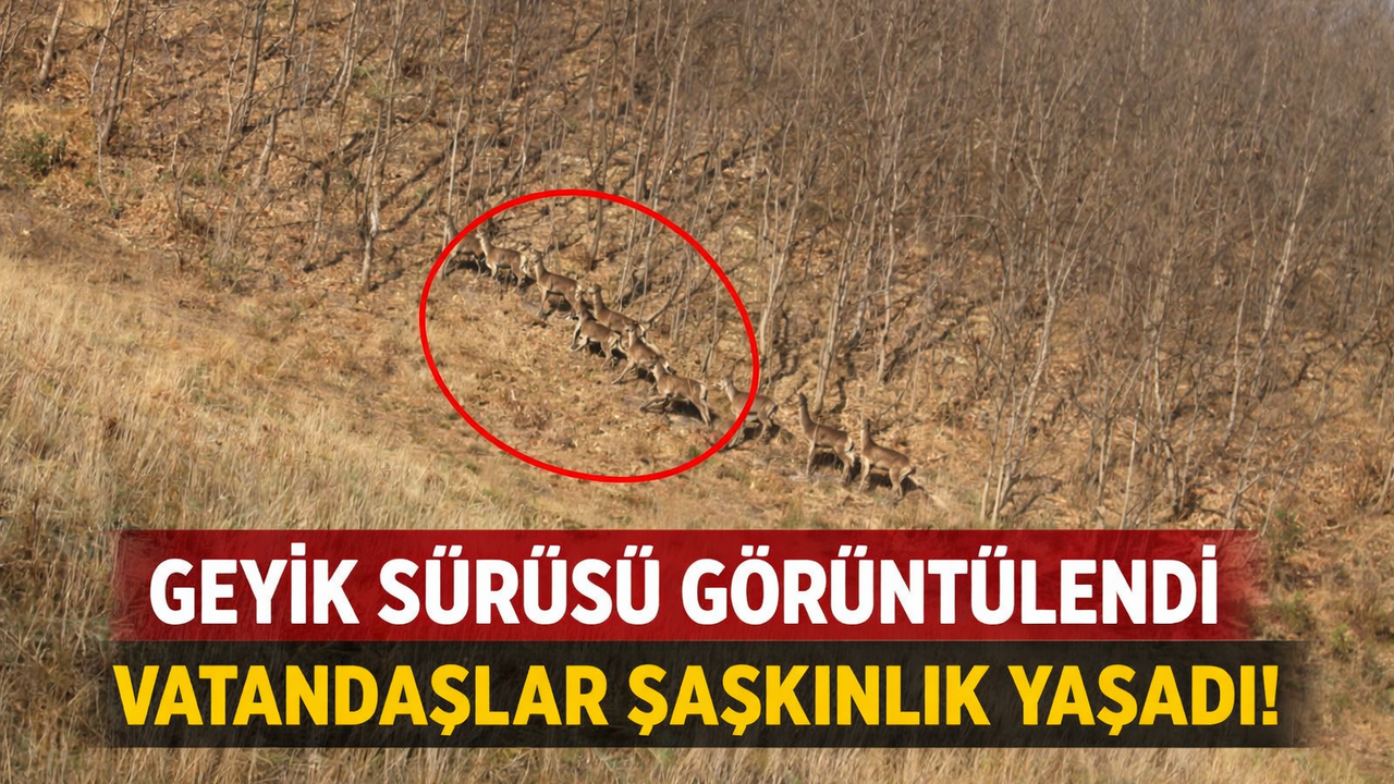 Edinilen bilgilere göre, yol üzerinde seyir halinde olan sürücüler aniden karşılarına çıkan geyiklerle büyük şaşkınlık yaşadı. Yaklaşık 8 geyikten oluşan sürü, bir süre yol kenarında ilerleyerek dikkat çekti.
