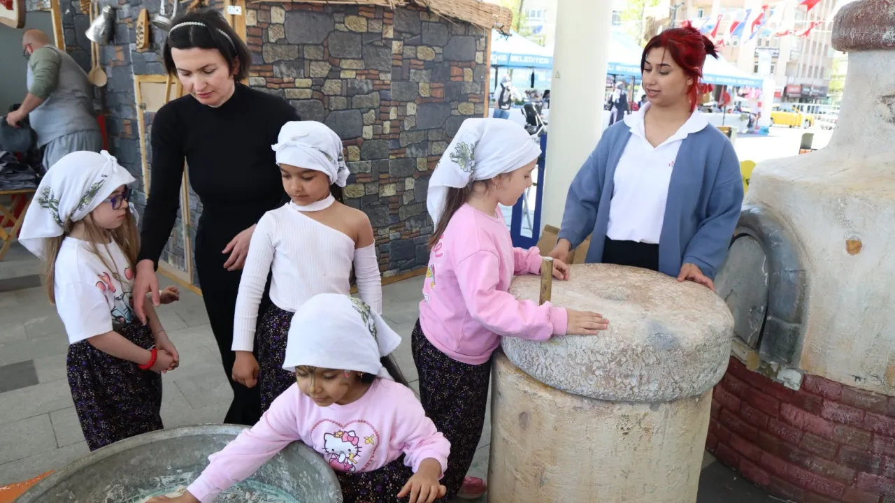 Köy hayatını yansıtan atmosferiyle kurulan etkinlik alanında çocuklar, ekmeğin sofralara ulaşana kadar geçtiği tüm aşamaları deneyimleme fırsatı buldu.