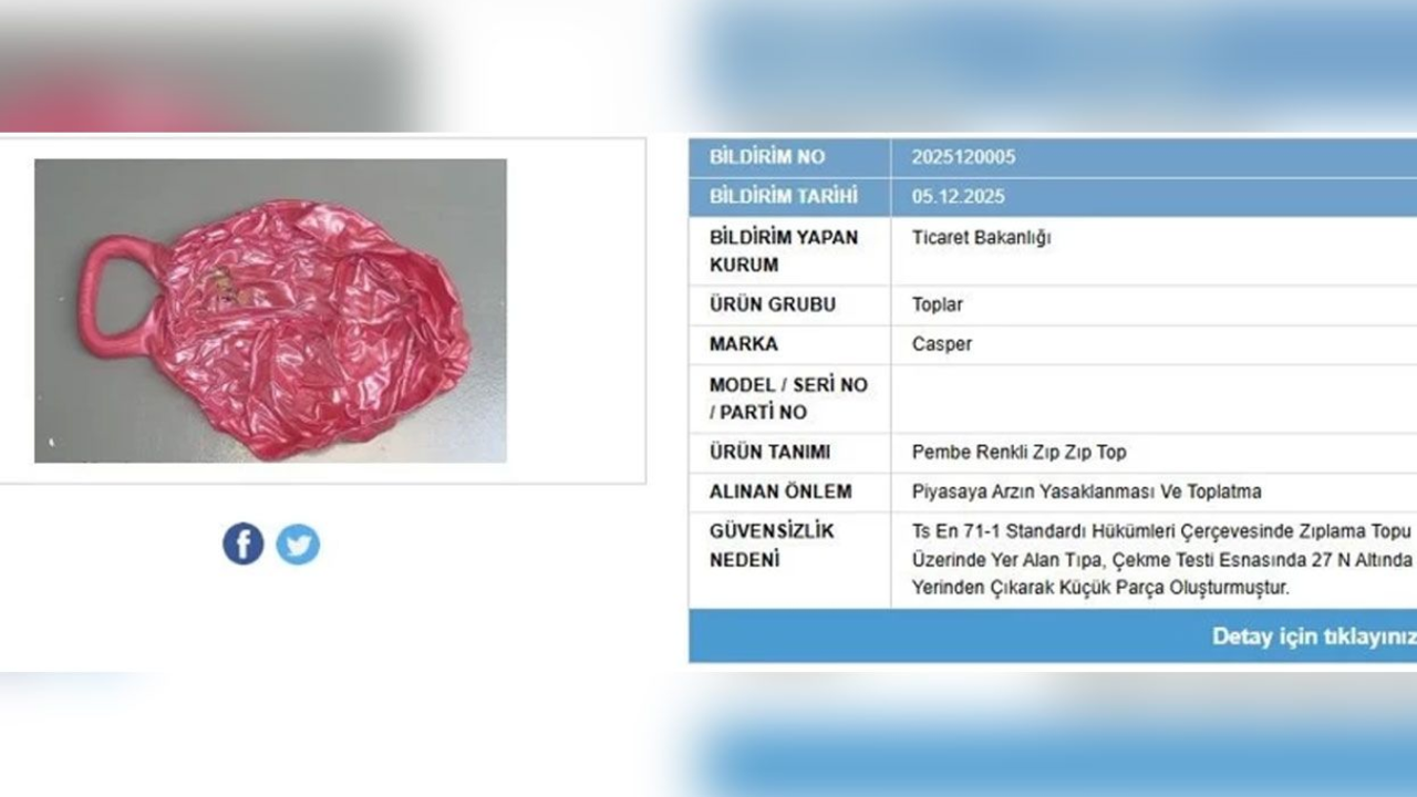 Ticaret Bakanlığı, benzer riskler taşıyan ürünlere yönelik denetimlerin aralıksız sürdürüleceğini vurgularken, vatandaşlara da Güvensiz Ürün Bilgi Sistemi’ni takip etmeleri çağrısında bulundu. Tüketicilerin, çocuklarının sağlığı açısından yalnızca güvenli olduğu onaylanmış ürünleri tercih etmeleri gerektiği hatırlatıldı.