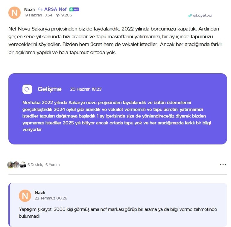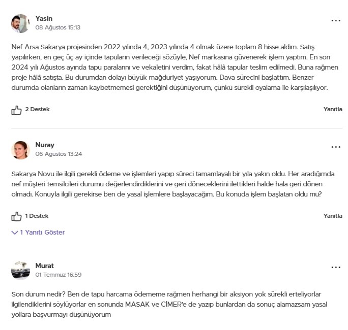 Projeler, Adapazarı ilçesi Bağlar Mahallesi mevkiinde “Nef güvencesiyle kira getirili arsa fırsatı” ve “Üniversite öğrencileri için konforlu rezidanslar” olarak tanıtılmıştı. Ancak 2025 yılına gelinmesine rağmen projede hiçbir ilerleme kaydedilmedi. Vatandaşların şikayetlerine konu olan tek unsur ise yıllardır arsada bekleyen ve rengi solan reklam tabelası oldu.