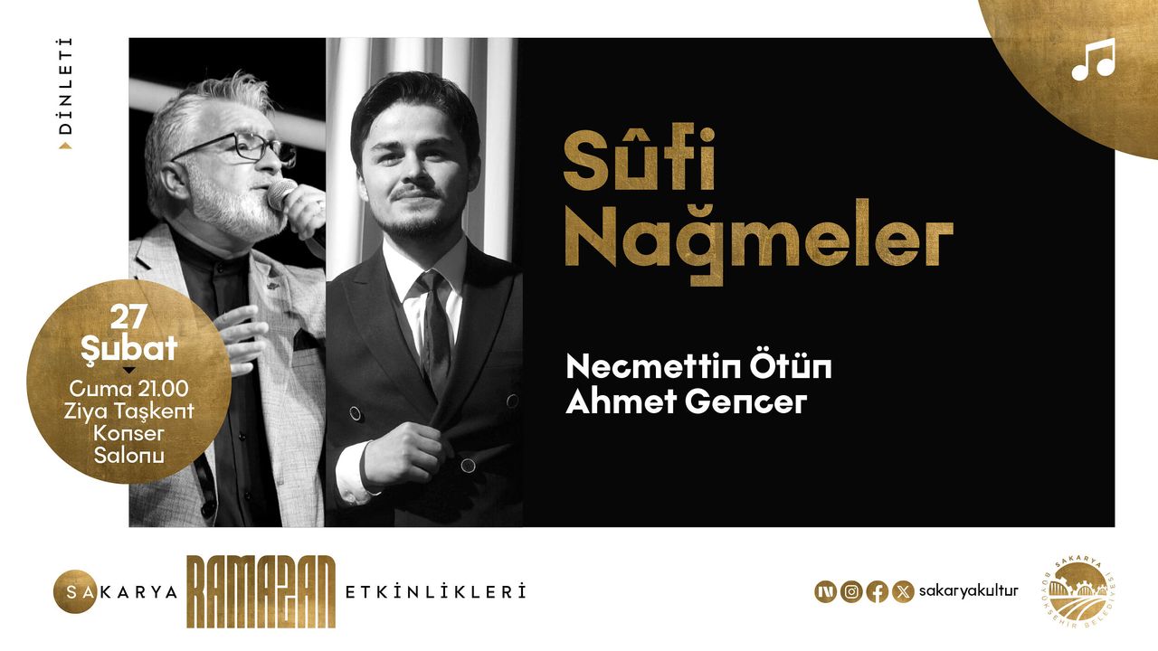 Ziya Taşkent Konser Salonu’nda gerçekleştirilecek program saat 21.00’da başlayacak. Dinletide tasavvuf müziğinin usta isimleri Necmettin Ötün ve Ahmet Gencer sahne alacak. Sanatçılar, tasavvuf musikisinin seçkin eserlerini seslendirerek dinleyicilere Ramazan’ın ruhuna uygun, manevi derinliği yüksek bir repertuvar sunacak.