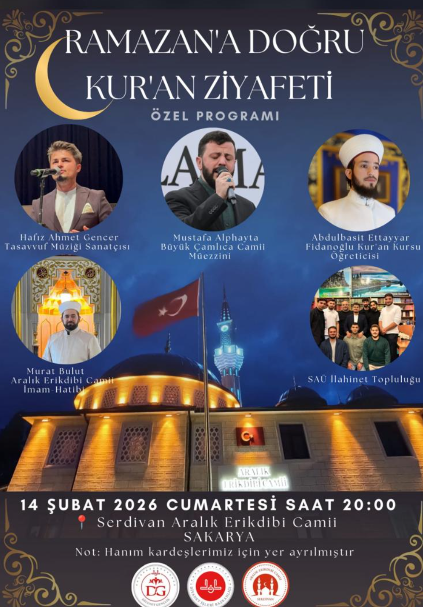 Ramazan ayı öncesinde manevi atmosferi güçlendirmek amacıyla “Ramazan’a Doğru Kur’an Ziyafeti” adlı özel program Serdivan’da düzenlenecek. Birbirinden değerli isimlerin katılacağı programda Kur’an tilaveti ve tasavvuf müziği dinletisi gerçekleştirilecek.