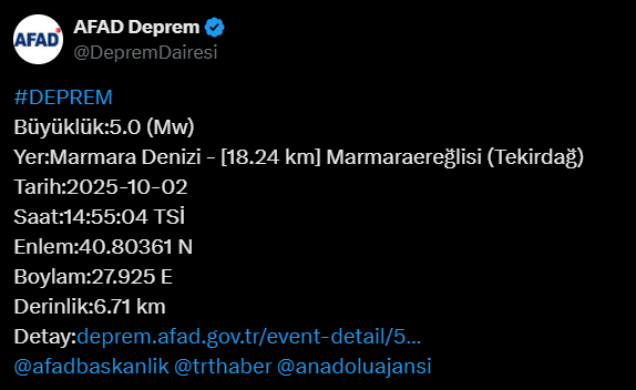 Öte yandan AFAD ise açıklamalarda bulundu. Afet ve Acil Durum Yönetimi Başkanlığı (AFAD), Marmara Denizi'nde meydana gelen 5 büyüklüğündeki deprem sonrası an itibarıyla olumsuz bir durumun bulunmadığını bildirdi.