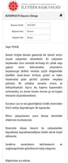 Tekin ayrıca, metro çalışmaları nedeniyle kendi binasında çatlakların çoğaldığını ve derinleştiğini belirterek, “Kapımızı zorlayarak açıyorduk. Metroya olan uzaklık yaklaşık 10 metre. Kızım bana CİMER’e şikayette bulunmamız gerektiğini söyledi. Yetkililer gelerek incelemelerde bulundu” ifadelerini kullandı.